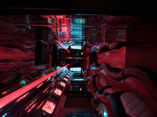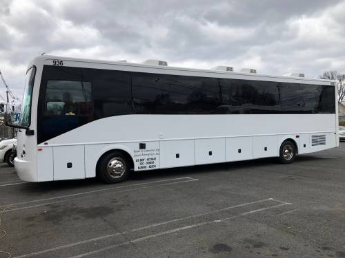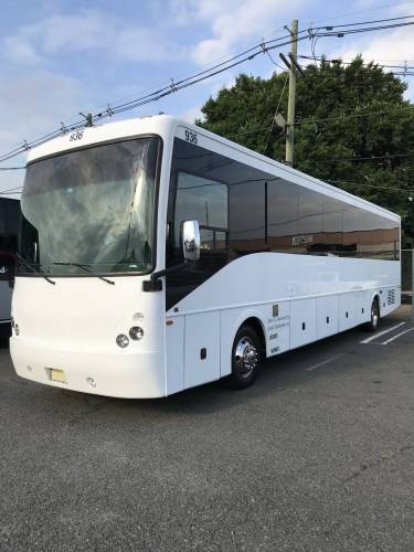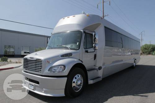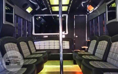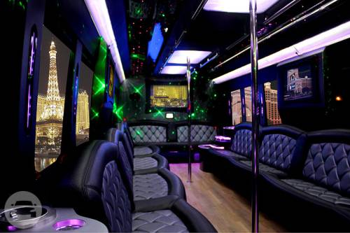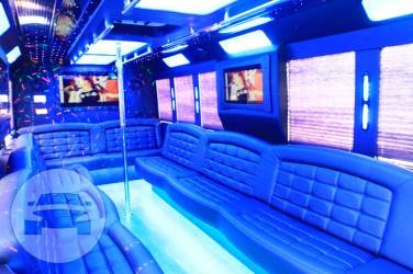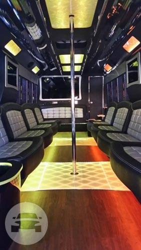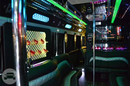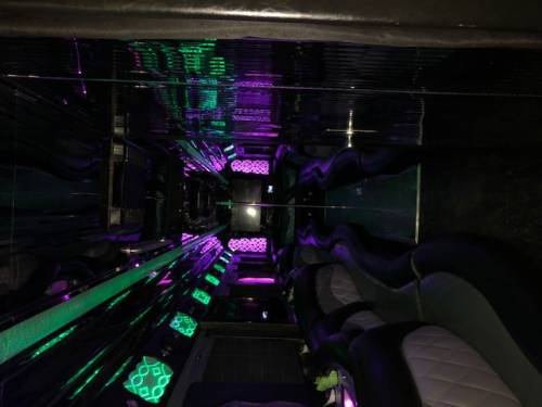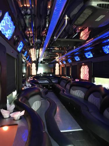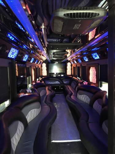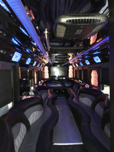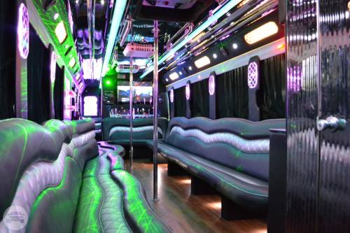 This exquisite fleet is considered ideal for wine tours, night outs, sporting events, tailgating, wedding transportation, etc. SPECIFIC FEATURES: ♦ Accommodates fifty passengers ♦ Wrap around seating style ♦ High quality surround sound system ♦ Stand up wet bars ♦ Dance poles ♦ Laser and neon lighting setting ♦ On board restroom ♦ Separate washrooms ♦ CD/DVD players ♦ Well crafted interior and celing ♦ LCD television ♦ Storage compartments