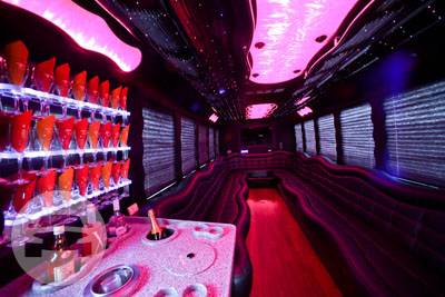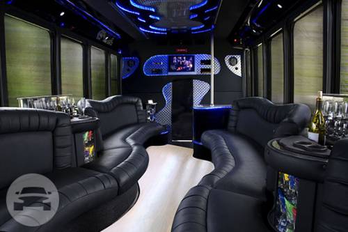 This is a beautiful black 26 passenger luxury limousine bus fully loaded with black leather surround seating, flat screen televisions, state of the art sound systems with mp3 and IPod hook ups, and colored LED lighting. It also comes with built in coolers for your convenience. Bring in your beverages ahead of time and we will stock them.