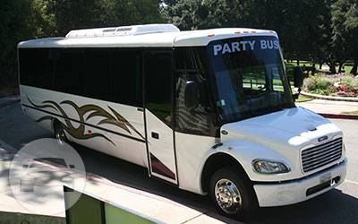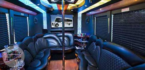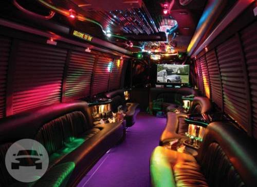 Our Freightliner limo bus is very popular for large groups to rent for a major party event, like a bachelor party, bachelorette party, birthday party or sports game because it can accommodate up to 30 passengers in luxurious comfort. Our limousine bus has (3) aconite-topped bars with cut glassware and plush leatherette seats that are extremley comfortable. Plus, you’ll experience complete privacy because it has shades on all windows, and a partition door between the cabin and the driver. Complimentary champagne, whiskey, vodka (over 21 years years old), soft drinks and bottled water is provided. You can bring your own beverages too. Our party limo bus seats 30 passengers comfortably. It has a hardwood floor, removable dance pole, laser show with (6) color settings, (1) 42″ TV, (1) 32″ TV, (3) bars with ice buckets, DVD player, iPod hookup, and one very loud surround sound system.