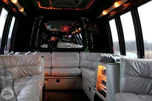 14 to 24 Passengers. • White exterior with plush grey leather interior • Fireworks fiber optic show • Window shades for privacy • Two large ice bins for beverages, 14-18 champagne flutes and lowball glasses • Upgraded sound system with iPod and AUX connectors • Large luggage capacity separate from the passenger area.