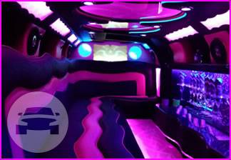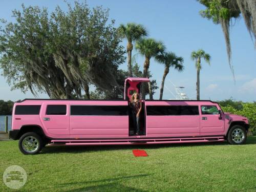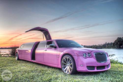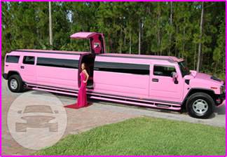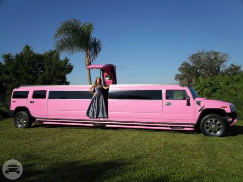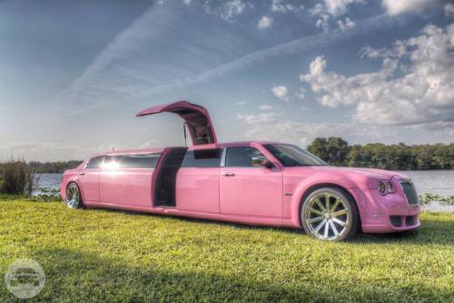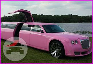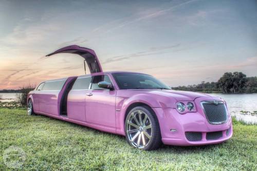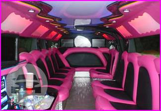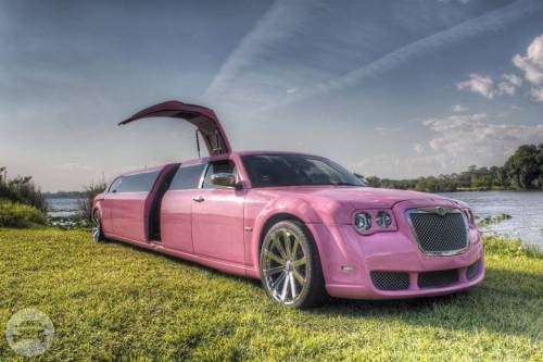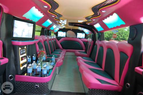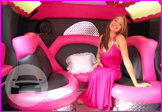 This 23 Passenger limo has a raised roof for comfort insidee the Limo and has Pink and Black Ostrich Skin upholstry with Black Corion counter tops at the bar with huge Ice Bins for your refreshments. Great party lighting inside the Limo and is equipped with a 9,000 watt stereo system with Pioneer sub-woofers behind the seats that will thump you. It also has roof speakers outside the vehicle for parades, parties, and other events. It has 5 large Flat Screens, DVD/CD/MP3/XM Radio, an iPod connection and Sony PlayStation. The exterior features a "Gullwing Jet Door" that turns heads and makes for easy entering and exiting the Limo. It is "Pink" in color of course with chrome wheels with cool neon lighting under the Limo for great ground effects. It has double Limo Tint on all the windows for your privacy and for an extra touch of presidential treatment we will Roll out the Red Carpet upon entering and leaving the Limo if you desire.