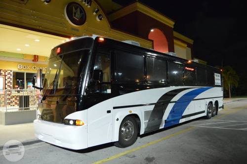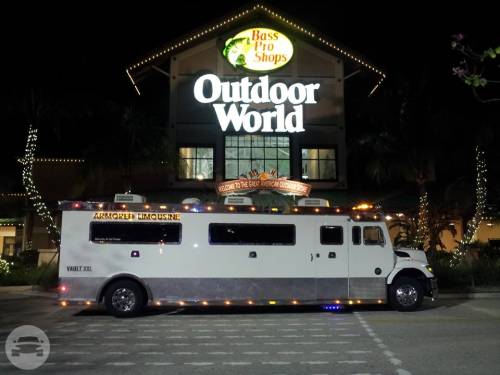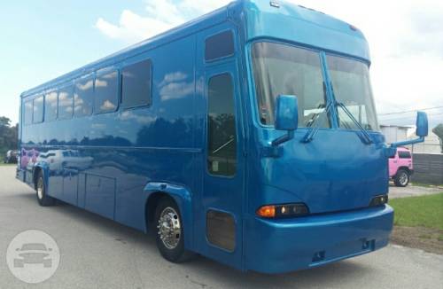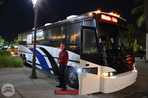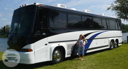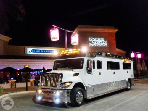 This Limo Bus will accomodate up to 38 passengers. It comes with 4 A/C units to keep you cool on those hot days in Florida. It has a very clean on board bathroom so you can keep traveling to your destination. The electronics include a 52" and a 30" Flat Screen TV, a 5,000 watt stereo system with sub-woofers to rock your world, and a DVD/iPod Connection. It's equipped with a "Huge Ice Bar" for your refreshments. The exterior is Two-Tone White & Blue with stylish chrome wheels and plenty of storage under the Limo for all of your luggage or equipment. This Limo Bus is great for weekend trips, day trips to the theme parks or sporting events, and can be rented for up to 2 weeks for your vacation, conferences, or other events. All of our Limo Buses can have custom banners or "Wraps" created with your sign or logo for an awesome advertisement at your special event.