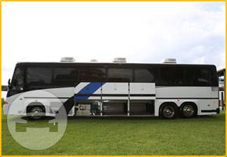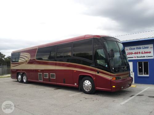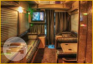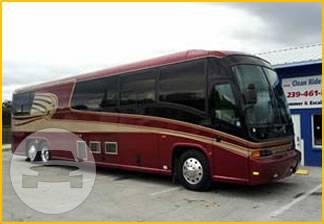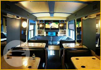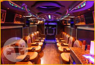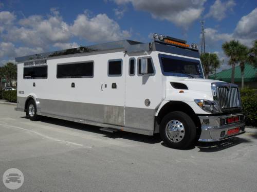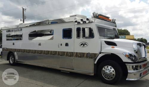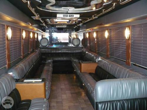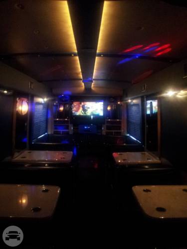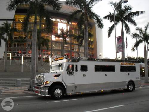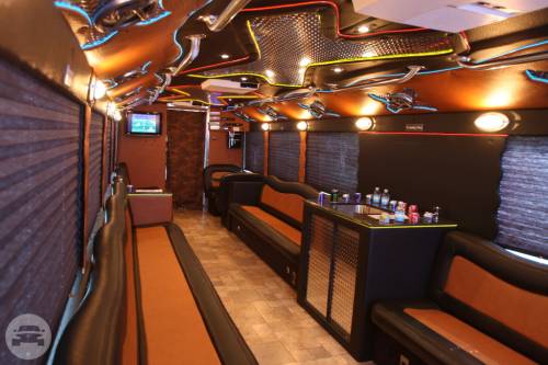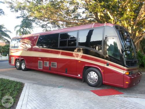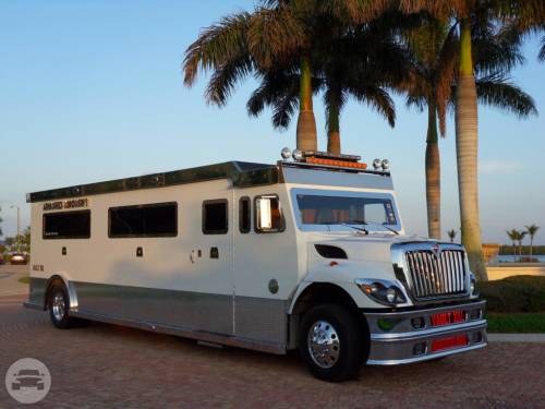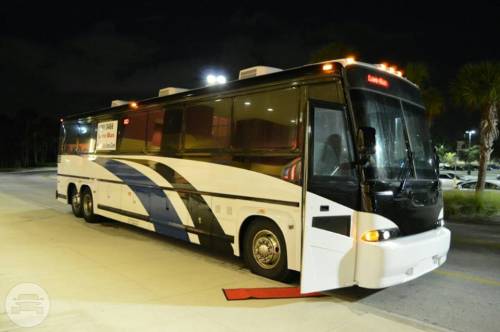 The interior is incredible with all the comforts for your day, weekend, or 2 week trips. It has an on board "Very Clean" bathroom, so this means "less stops" and keep the party moving! It has a huge Ice Bar and 3 cold A/C units to keep you cool in this Florida weather. The electronics include a 52" Plasma Screen, and a 32" Flat Screen TV, a 5,000 watt stereo system with sub-woofers, DVD/Karoake Machine, and an iPod connection. The exterior is a classy Burgandy color with Gold Trim design. It has plenty of room under the Limo Bus for all of your luggage or equippment. You can rent this Limo Bus by the day (4/hr. min), the day or the week for longer trips. All of our Limo Buses can have custom banners or "Wraps" created with your sign or logo for an awesome advertisement at your special event.
