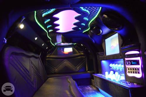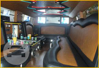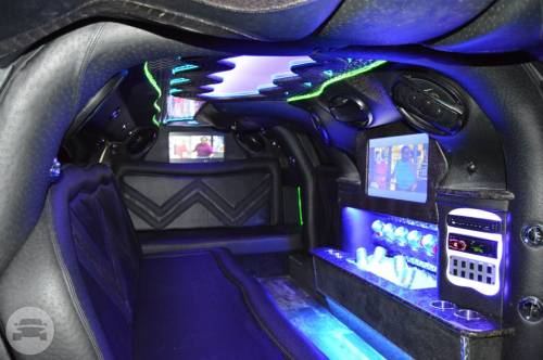 This Hummer Limo comes equipped with Black & Tan Ostrich Skin interior throughout, Black Corion counter tops, and hard wood floors. It has an excellent A/C system to keep you cool on those hot Florida days and extra large Ice Bins in the bar. It comes equipped with very cool party lighting to set the atmosphere for your party. The electronics include 4 large Flat Screens, a 5,000 watt stereo system with Pioneer sub-woofers behind the seats. It has roof speakers outside for parades or other special events. It is equipped with DVD/CD/MP3/XM Radio, an iPod connection and a Sony PlayStation for entertainment. The exterior is white with cool chrome wheels and double Limo Tint on all the windows and has neon lighting under the Limo for cool ground effects!