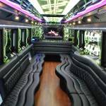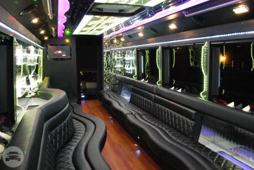 Our 20 passenger limousine bus is the ultimate rolling party. With a rocking sound system, fiber optic lighting, leather seating and flat screen TV’s, the party on this bus doesn’t stop until it reaches its destination. Perfect for the night on the town, Wedding Limo, Birthdays, Sporting events, wine touring or this is the perfect transportation solution for larger groups that enjoy the luxury of the extensive cabin room. This is Washington DC’s newest party bus and has been custom made by for Presidential Limousine. The party bus offers leather seating, chrome wheels, custom surround sound, strobe lights, flat screen TVs, dance light shows, privacy shades, chauffeur telephone access, dual control stereo and lighting systems, I-Pod hook-ups, laser light shows, bar areas for bottle storage, ice bin storage, and custom glassware. This party bus is perfect for a group of friends heading out for a night on the town in a Virginia Party Bus.
