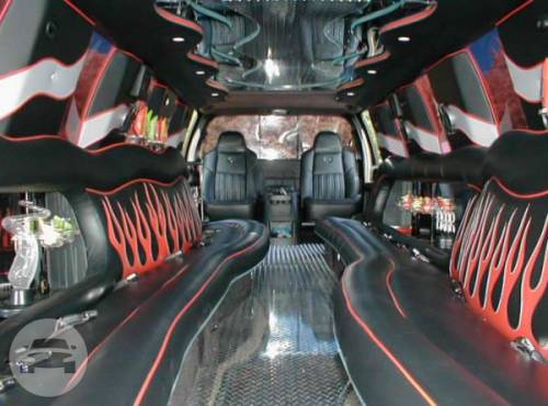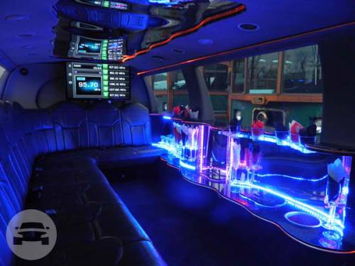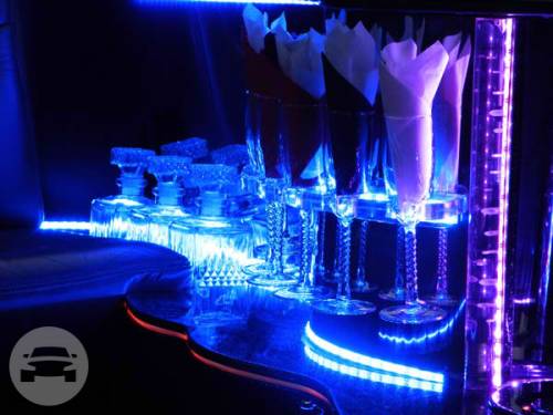 Black Celebrity 5th Door Limousine "Travel in style like they do in Hollywood" Seating for 8 - 10 This vehicle is equipped with j-seat in charcoal gray leather. Back lit bar that stretches along one whole side of the car and equipped with rock glasses, champagne glasses, ice bins, & champagne well. In j-seat curve there is also champagne well with 4 champagne glasses. TV remote controlled, stereo & CD player and as you play CD & stereo you have dancing lights all around you. Solid divider between passengers & driver, customer controls for climate & lighting.