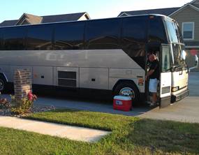Bus rental in Kansas City will never be the same once you see this. Wow! Fine hotels don't offer these luxurious finishes - travertine tile, granite counter tops and stainless sink wells. Everyone is astonished by the mammoth limo style seating in lush ostrich leather. You can watch the 50-inch plasma television in upmost comfort. Play your DVDs and soak in the vibes with the ultimate sound system and when the mood strikes, turn on the strobe and laser lights to take it to another dimension. Now wrap this mind-boggling coach style suite in champagne silver and you are beginning to get the picture. This is a luxury extravaganza on wheels with a capacity of 40 passengers and tons of extra storage below. It is truly a work of art, and it books fast. Please email or call us so we can answer all your questions and provide current availability for all our transport services. Prices are very reasonable. Service is flawless. And, all vehicles are well maintained and pristine clean.