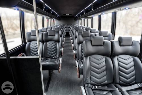 New for 2016 and EXCLUSIVELY available at Overland, we now welcome the latest edition to our premium-level fleet portfolio, the Executive Mini Coach. The sleek lines, plush, luxury leather-like interior, premium amenities and exceptional ride all create a first-class experience for your larger groups of up to 37 passengers. This vehicle will “wow” your guests and make a lasting impression for any corporate event or leisure occasion. Amenities include: High-Back custom black leather-like seating with elite arm rests and seat belts, reclining (except for rear row) Wood laminate flooring Premium touch screen AM/FM/CD stereo, DVD player 2 LCD monitors in bulkhead, 4 LCT monitors in luggage racks 110V/USB outlets in every row Individual reading lights PA System WiFi available on request Incredible OEM Air Suspension