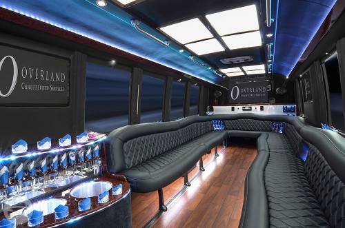A true luxury coach experience awaits you! For groups of up to 22 that want limousine amenities and true comfort and ease of exit and entry, a limousine coach is your best option. Walk up into your own private “club room” with the following features: Black leather perimeter seating Wood laminate flooring Walnut bar and accents Large LCD Flat Screen TV in rear & 2 on the sides with DVD & DirectTV Satellite Premium sound system with CD, satellite radio & MP3 hook ups Accent lighting and pull-down shades Ample storage for chilled beverages and glassware The sleek, classic and tasteful appearance of this coach provides versatility not only for corporate meetings and events but also any variety of wedding and special occasions. Experience one of the most impressive luxury coaches in the Kansas City market! Helpful Hint: Seating Capacity is always based on estimates and maximum seating capacity will decrease for larger or taller adults. We cannot by law seat more than capacity but we do not recommend maxing out seating capacity either for comfort reasons and wear and tear.