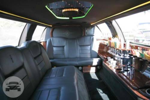 Black Lincoln Limousine!! Seating for 8 This limousine is equiped with 3-seat configuration in soft black leather. One bar along the whole right side equipped with ice bins, rock & champagne glasses, a huge flat screen TV, stereo & CD/DVD player, and a fiber optic sunburst. Full stargazer ceiling, fiber optic and mood lighting.