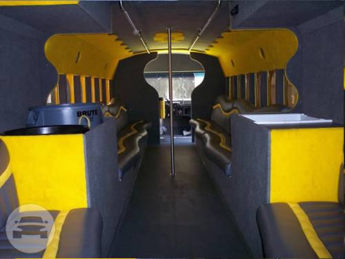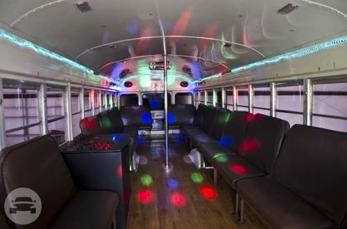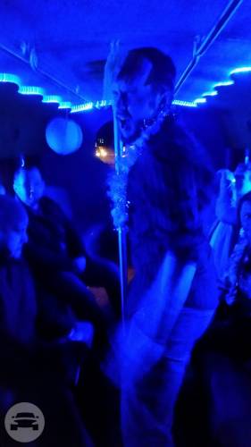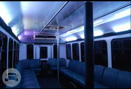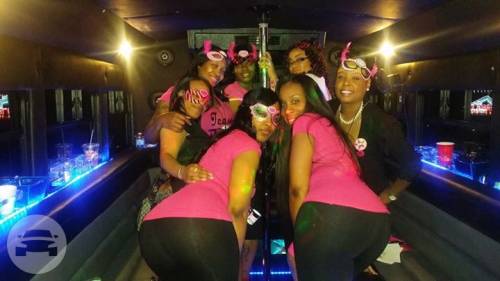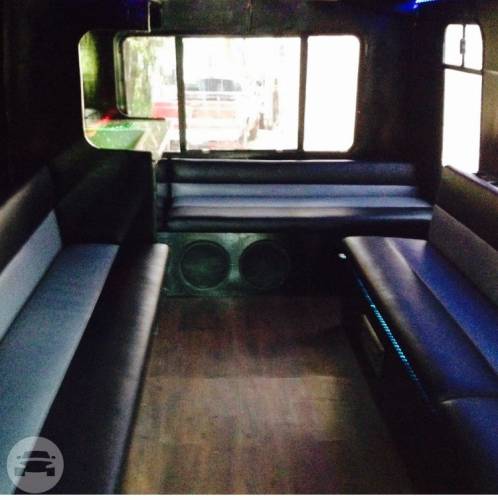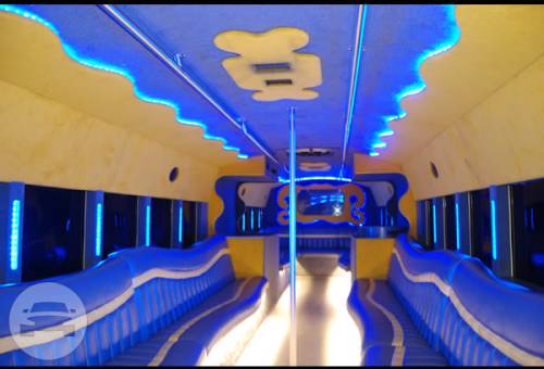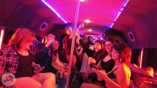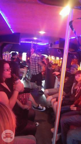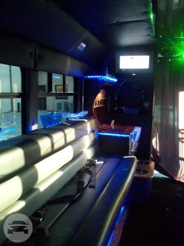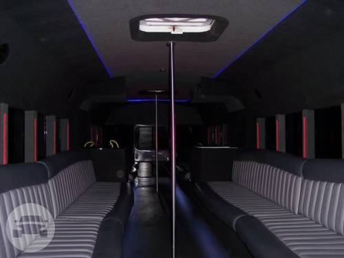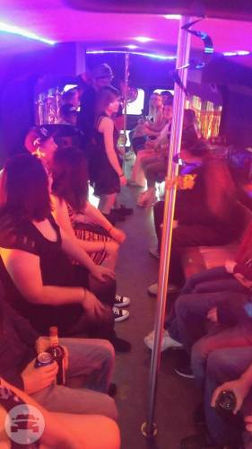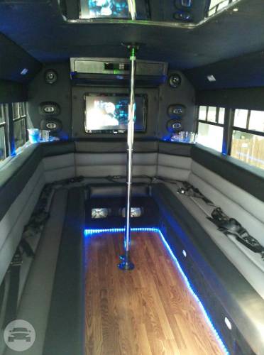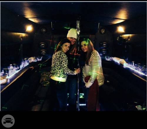 34 passenger limo style perimeter seating dual heat and a/c award winning sound system with cd, ipod,and mp3 capability 2 bar areas with ice well, keg holder, and trash receptacle 2 dance poles custom designed led lighting including ceiling, walls, and floor 60 built in cupholders