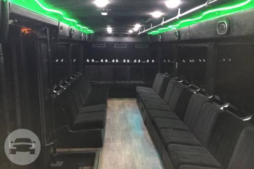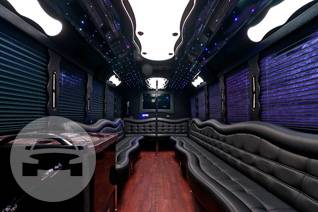 Comfortably Seats 26 People Multi-colored entertainment lighting Black Interior Wood Grain Flooring Three Flatscreen LED TVs Surround sound iPod Hookup DVD Player Glassware Rear Storage Area Dance Pole GPS Navigation System to Facilitate Travel