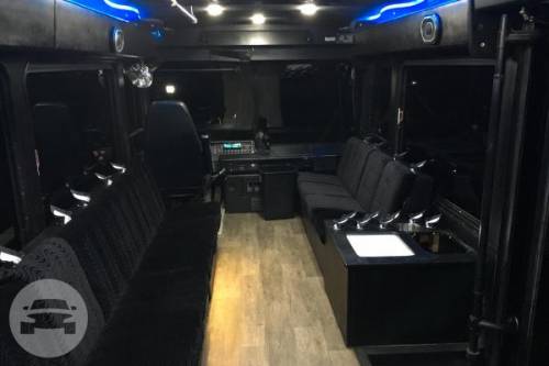 Comfortably Seats 22 People Black Interior Wood Grain Flooring Four Flatscreen LED TVs Alpine Stereo with 8 speaker surround sound iPod Dock DVD Player Glassware Mini Fridge Dance Pole GPS Navigation System to Facilitate Travel