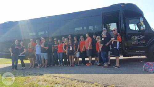 Multiple sizes seating 10-34 passengers comfortably Premium audio/visual systems w/ big screen TVs,DVD, Bluetooth and ipod Next generation fiber optic lighting package (passenger controls) Black on black perimeter leather seating with wood grain floors Large viewing windows with adjustable shades for privacy Luggage compartment rear of vehicle and under seats