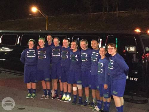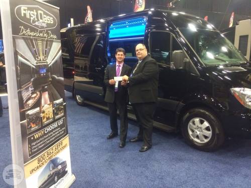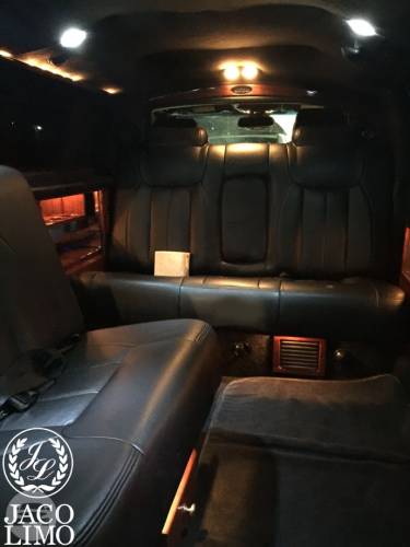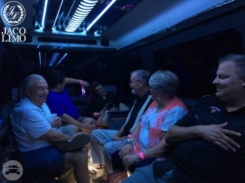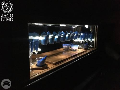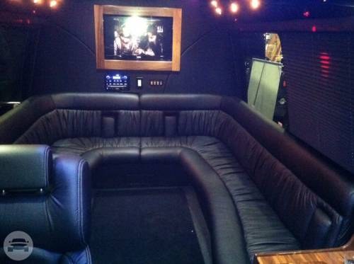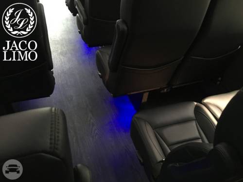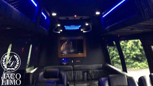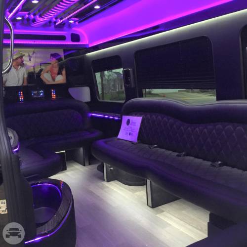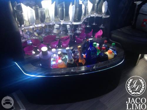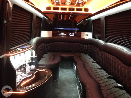 Capacity: 16 passenger seating Plush leather perimeter seating Radio w/ Bluetooth (2) Bars w/ Rock & Flute glasses Privacy partition LED Fiber optic lighting