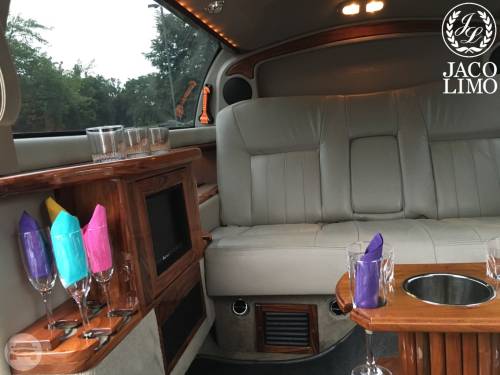 Capacity: 10 passenger seating Plush leather seating Surround sound Privacy partition LED lighting Rock and flute glasses Popular 3 bench seating