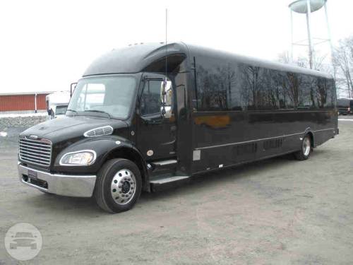 Capacity: 35 passenger seating Plush reclining leather captain chairs Restroom Rear and overhead luggage In motion satellite television LED lighting