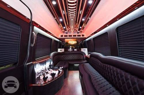 Capacity: 14 passenger seating Plush leather perimeter seating Surround sound (2) Bars with rock & flute glasses LED fiber optic lighting Privacy partition