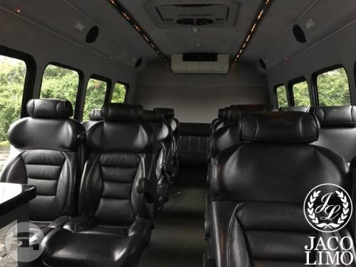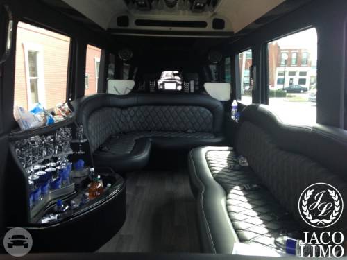 Capacity: 20 passenger seating Plush leather captain chairs Plush leather limo seating in rear Surround sound Refreshment bar w/ rock glasses Rear luggage