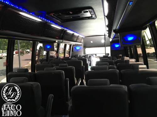 Capacity: 31 passenger seating Plush reclining leather captain chairs Table Overhead luggage LED lighting TV screens AUX and Bluetooth