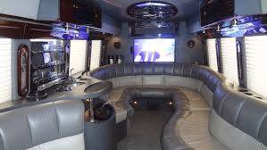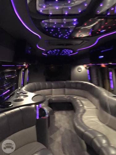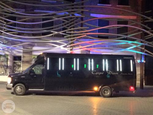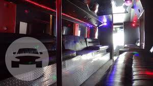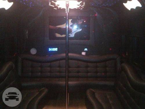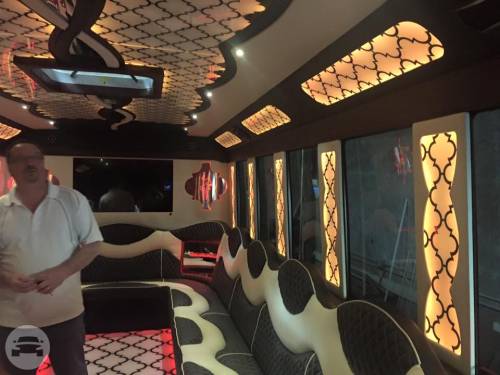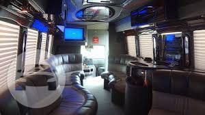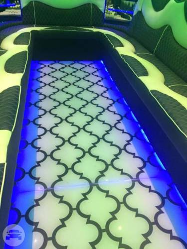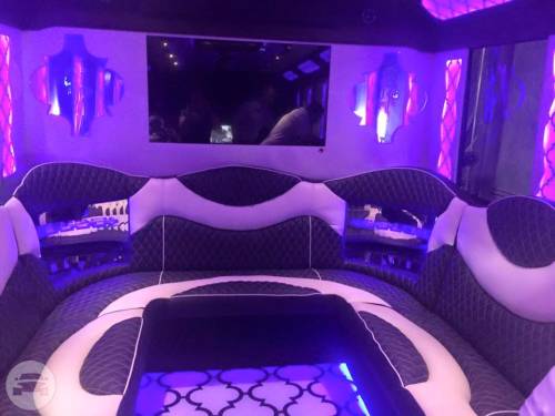 Gloss black exterior with frameless tinted windows Sleek design, inside and out. Our highest priced bus, but worth every penny Equipped with a stripper pole and four TV's Heart pounding stereo Laser lights, LED lights, & strobe lights Seats 18 - 20