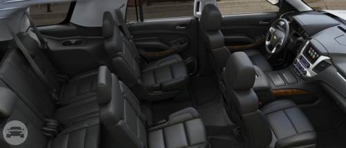 6 passenger capacity Black interior and exterior Premium sound system, DVD, flat panel monitors, climate control Chevy Suburbans