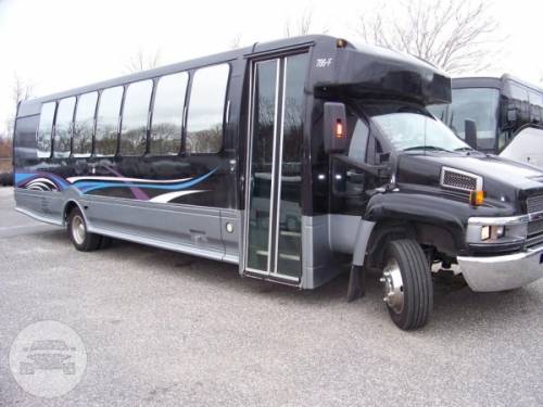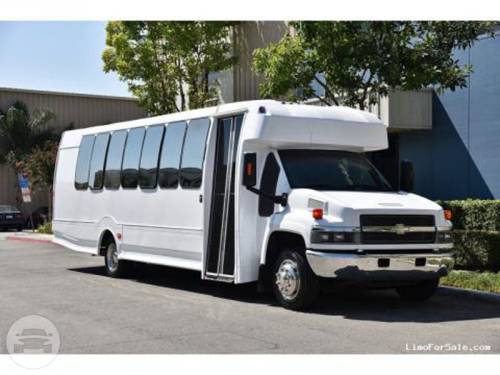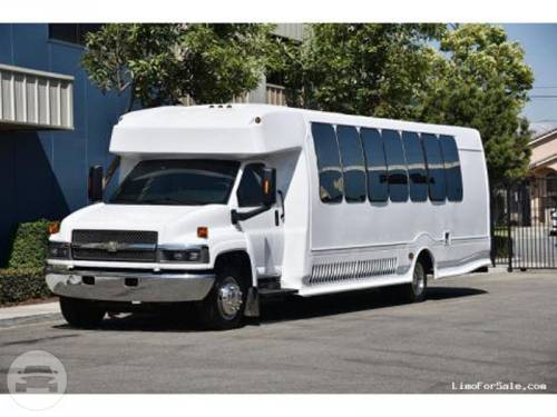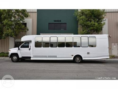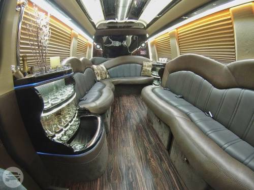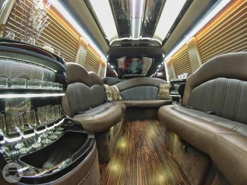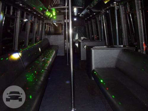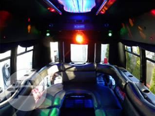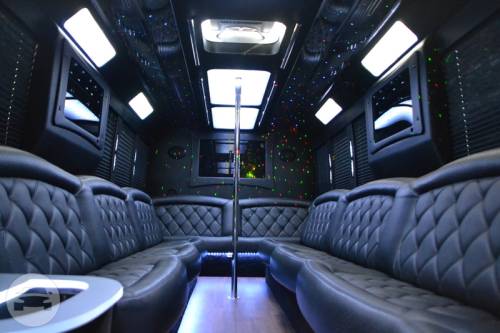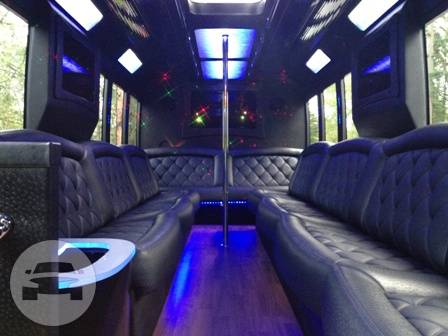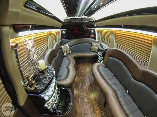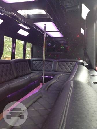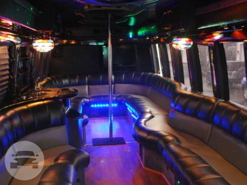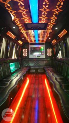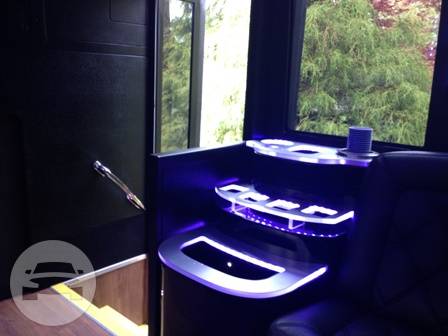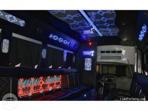 Manufacturer: Tiffany Coachworks on Ford Chassis Model: F-550 Year: 2012 Passenger Capacity: 22 comfortably, up to 25 maximum Entertainment: 4 LCD HDTVs, DVD, Radio w/ CD, auxiliary & iPod hookup + 6 Channels & 4 Subwoofers Lighting: Interior LED lights w/ color changing "light show", strobe lights, lasers, bar & tumbler lights, LED star lights, under seat rope lights Bar Amenities: Includes full bar w/ large forward ice bin and smaller rear ice bins Seating: Wrap around plush leather seats Climate Control: Digital electronic heating & air conditioning system Glassware: Plastic cup ware provided