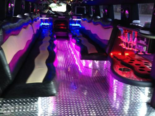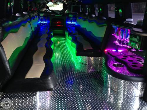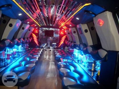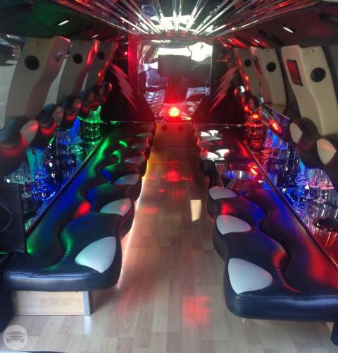 Ride high in comfort and style with our 14 passenger H2 Hummer. Treat your friends and yourself to the spacious luxury afforded Limousine. H2 HUMMER SEATING FOR 14 White Exterior Black and Brown Interior Fire Place Wood Floor Air Conditioner Disco Lights Cups and Napkins CD/DVD/ & TV plus FM/AM Stereo Sound System iPod/iPhone Connections (AUX Input) Upgraded Speakers & Subwoofers for Ultimate Sound Party! 2 Bar Areas with Ice Chests Throughout Upgraded Chrome Wheels on the Exterior of the Limousine