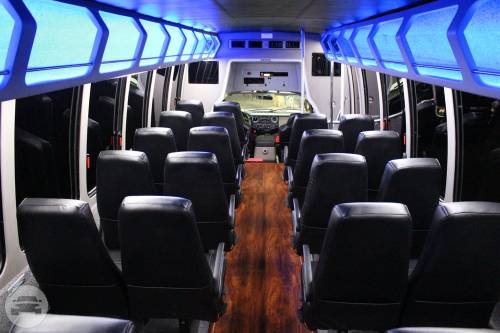 Up to 29 passengers Black leather reclining seats Wood floor Blue accent lighting Intercom system Overhead luggage compartment Reading lights Separate large cargo area