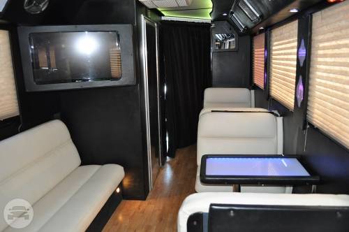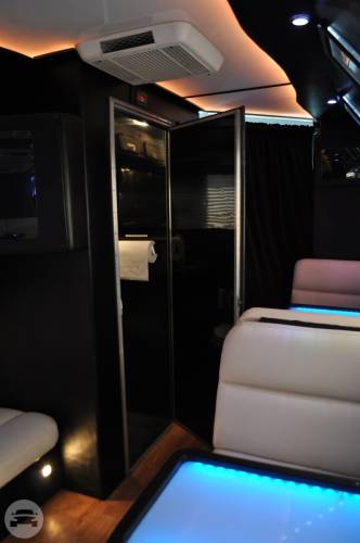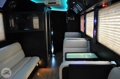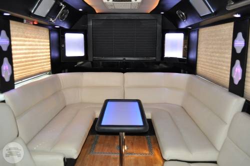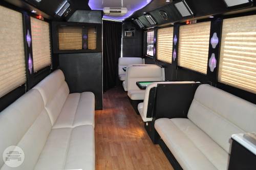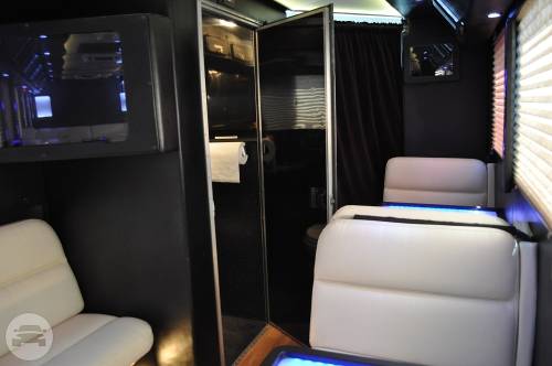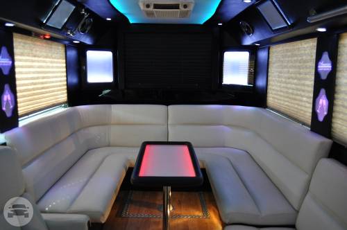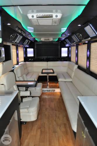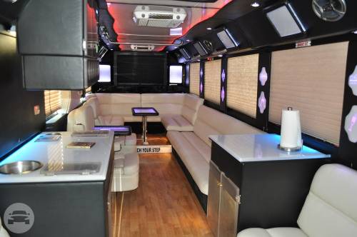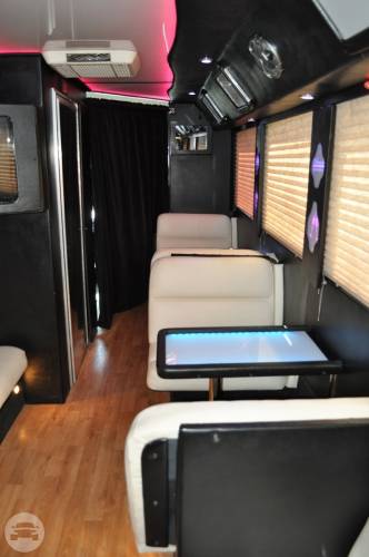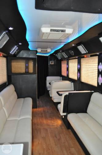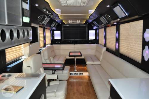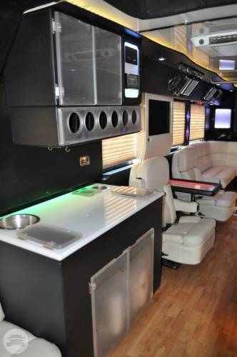This exquisite fleet is considered ideal for wine tours, night outs, sporting events, tailgating, wedding transportation, etc. SPECIFIC FEATURES: ♦ Accommodates fifty passengers ♦ Wrap around seating style ♦ High quality surround sound system ♦ Stand up wet bars ♦ Dance poles ♦ Laser and neon lighting setting ♦ On board restroom ♦ Separate washrooms ♦ CD/DVD players ♦ Well crafted interior and celing ♦ LCD television ♦ Storage compartments