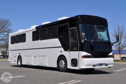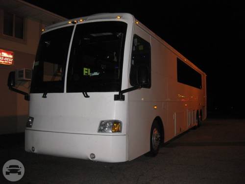 One of Legend's newest buses, the Black and White 46 Passenger Limo Bus is one of the most impressive vehicles to hit the road anywhere. Comfortably seating 42-45 people, the Black and White exterior makes it an ideal choice for large Wedding parties as well as Corporate functions. The paint is mostly white in color, with black that goes from the top of the bus to about half way down the sides. The frameless windows are tinted and give the side profile of the bus an ultra-sleek design. Xenon headlights and Ultra-Bright fog lights complete the nose of the bus. Polished aluminum wheels show a mirror-like reflection. Under Belly Luggage compartments will hold luggage for 35-45 people (depending upon sizes of bags). Regardless of occasion, this bus comes with a host or hostess that will work all of the many interior features. The three-tone seats are black outside, with dark grey outline and light silver diamond pattern inserts. Black wood flooring makes the interior feel very modern. The stainless steel dance pole towards the rear of the bus is easily removable upon client request (with at least 24hrs advance notice). Two large coolers towards the rear hold enough soda and bottled water for every guest. The host station with all the lighting, climate, and entertainment controls features a working sink with fresh water. Color changing lights in the stainless steel cieling, in all the bar areas, and underneath the seats are all coordinated to change color at the same time. These same lights can be fixed to stay white for a less partylike atmosphere, or any specific color for themed occasions. There is a 72" television on the back wall, one 55" television on each side of the bus, and a 27" television on the front wall, totaling 4 televisions.