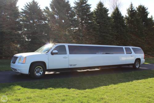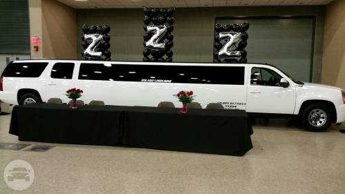DETAILS 20 Passenger Stretch GMC Yukon Twinkle ceiling lights, mood lighting, and laser CD/AUX input Privacy Partition Three drink bars
