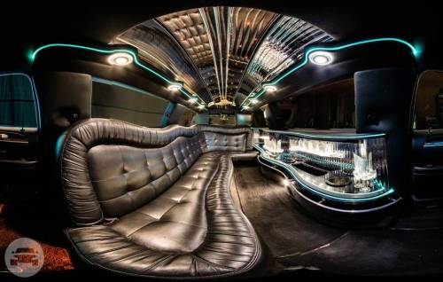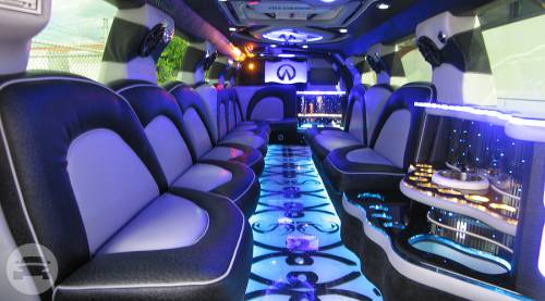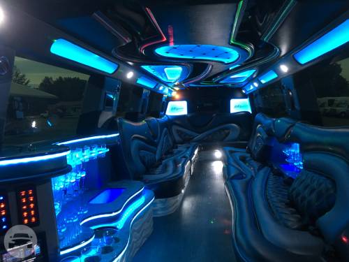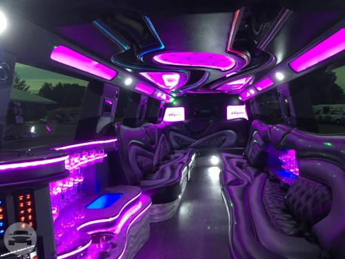 Passengers: up to 20 Our white H2 hummers are unique in their own right. One of the interior seating is accented in black-white-purple cheetah print, hardwood floors and wet bars lining each side of the limousine! Complete with top-of-the-line audio and video systems, you and your guests can enjoy your favorite playlists while riding in the fiber optic lights placed throughout!