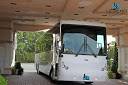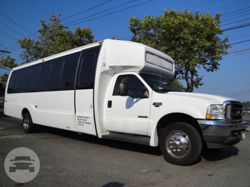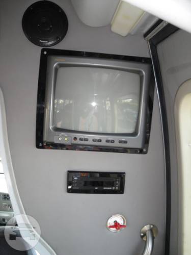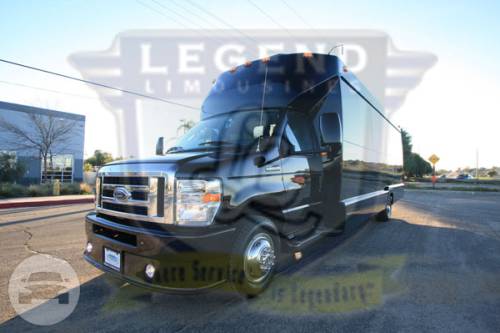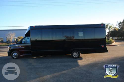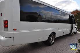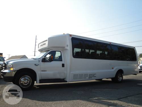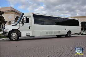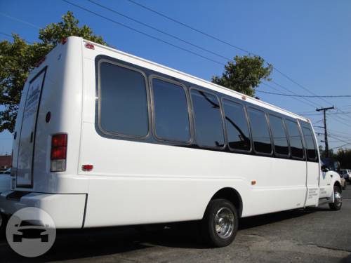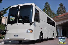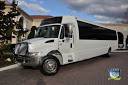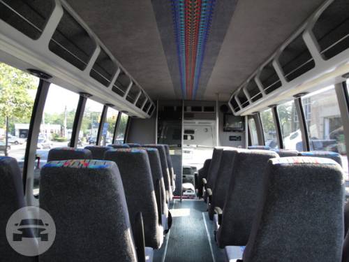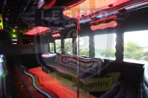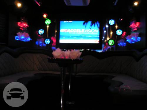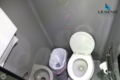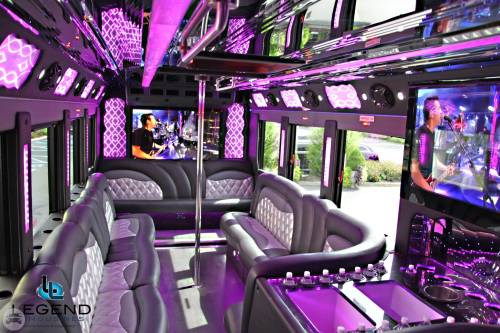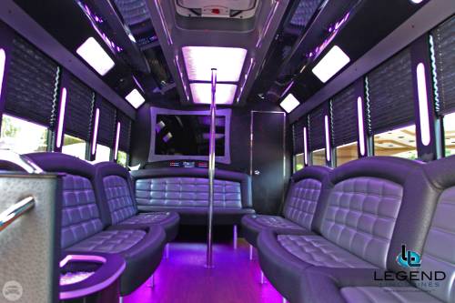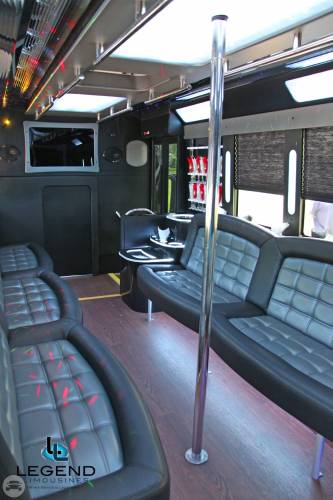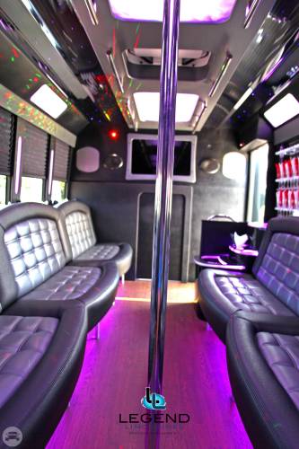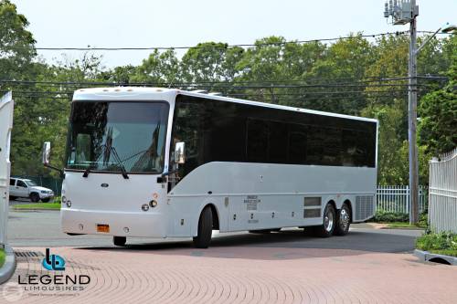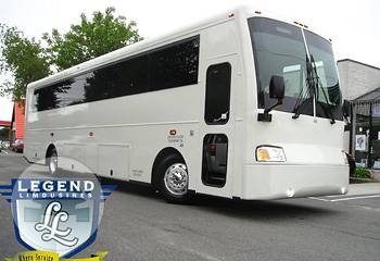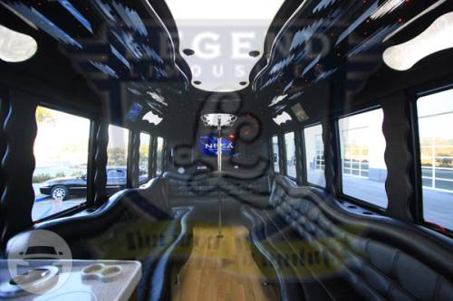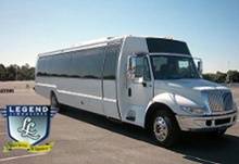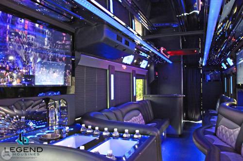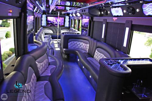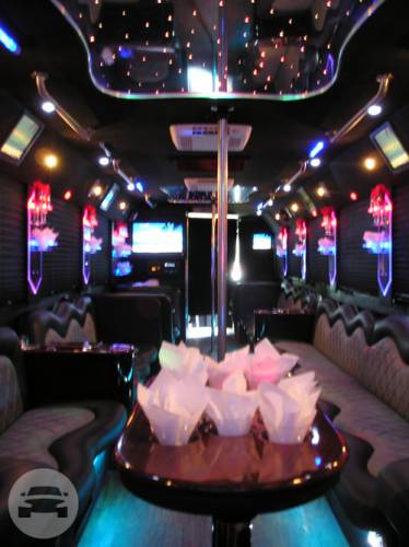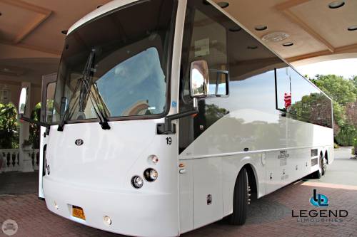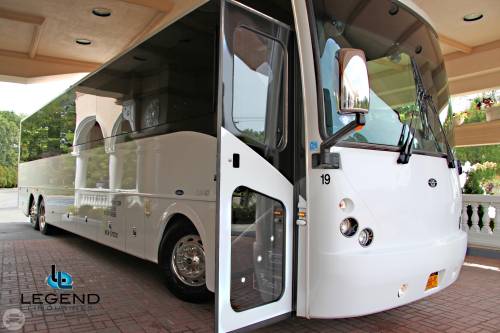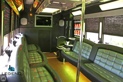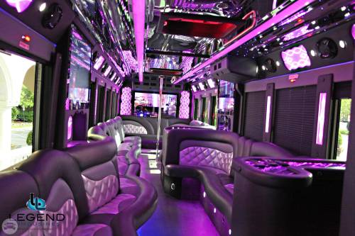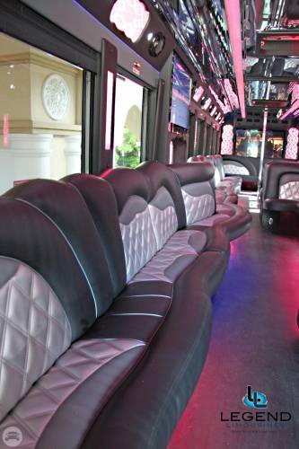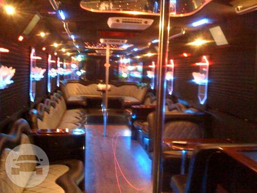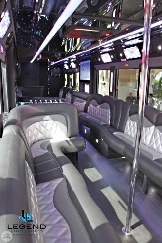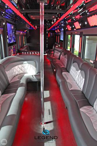Comfortably seating 38 people, this White Diamond 40 passenger Party Bus was custom designed by Legend Limousines, Inc. with every need our client's may have. The exterior of the bus is a solid, "White Diamond" color, (selected to match well with our Bentley or Cadillac Limousines). The tinted, frameless windows give the bus a sleek and modern look. For those concerned with the environment, we added an oversized generator to power all of the amentities inside, (perfect for tailgating or for business meetings). The generator allows the bus to sit idle for hours without the main engine running, burning less than one gallon of fuel an hour, and drastically reducing the bus's carbon foot print. There are giant luggage compartments that provide plenty of storage for bags, or even, extra large coolers. Ground effects lighting surround the bus, and may be configured to any color the client would like. Step inside the bus, and you will be amazed by all of the features. The first thing you notice is the wood floor and finished wood bars and tables. Down the center of the bus are two stainless steel poles, which are easily removed for more intimate gatherings such as Weddings and Corporate outings. The bathroom features porcelin facilities including a urinal, and a corian counter top with working sink. The entertainment package is state of the art! For lights, there is the fiber optic with twilight effect on the ceiling, color changing fiber optic lighting under the seats to light the floor (set to any color you would like), there are 10 black lights, 10 strobe lights, 4 laser lights, a disco projector light, and 6 static lightning dishes. All of the lighting is further enhanced by a fog machine. It is important to remember that all of these features are individually controlled by the passengers, allowing them to create any type of atmosphere that they desire! Mounted on the rear wall of the bus is a 42" flat screen television, mounted outside the bathroom wall is a 35" flat screen television, and mounted on the sides of the bus are an additional 5 televisions, totaling 7 televisions! These play DVD's or Slide Shows. As well, they have USB jacks for computer presentations. The stereo system is equipped with 12 speakers and 6 sub-woofers, which definitely turn the bus either into a luxuorious movie theatre, or a night club on wheels. So whether your moving a large bridal party with style, hosting a corporate outing for a long drive, or whether it's a leisure night out with friends, this vehicle will get you there with style.