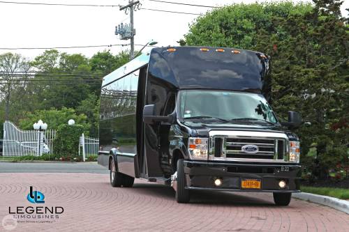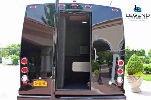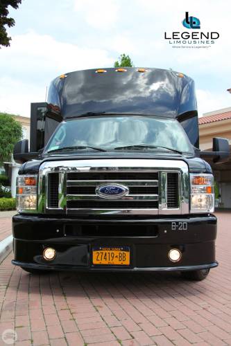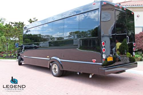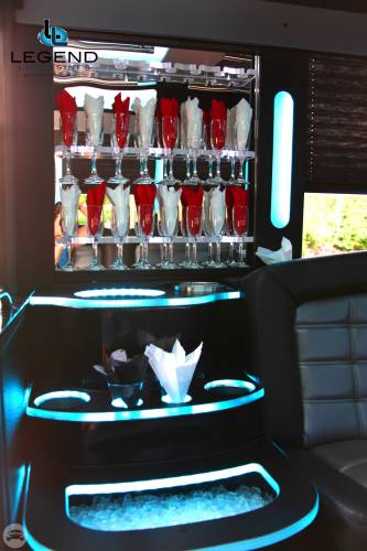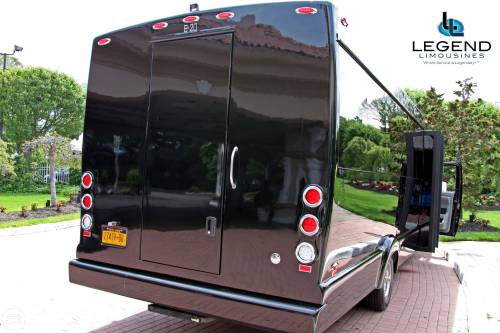 One of the hottest looking buses to ever be built, Legend’s all Black Limo Bus offers the ultimate in curb appeal. The exterior features a seemless fiberglass body with sleek, frameless windows. The aluminum wheels and custom bumper with ground effects add to the “wow” factor. The interior is perfect for any occasion. Comfortably seating 18 people, this bus offers a full 8 feet of headroom. Interior options include hardwood floors, custom leather seating, and a hand crafted corian bar with a wine bottle refrigerator. For entertainment there is a total of 4 flat screen televisions (35” TV on the back wall, a 27” TV on the front wall, and 2 15” TV mounted on the side walls). The 1,500 watt stereo system includes 2 12” sub-woofers. A stainless steel pole is mounted toward the rear of the bus, and is easily removable for a more subtle occasion. The rear luggage compartment also make this a perfect option for airport & cruise ship transportation.