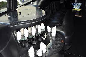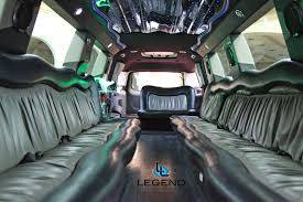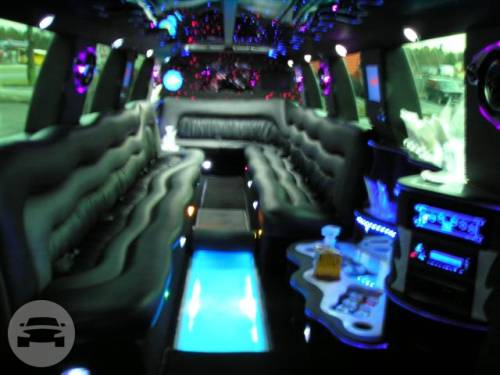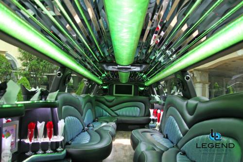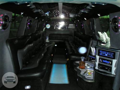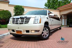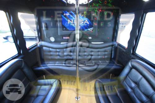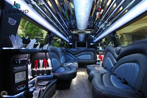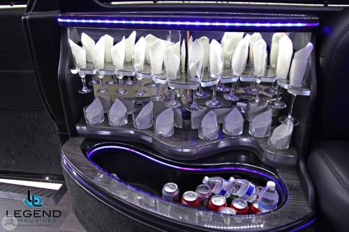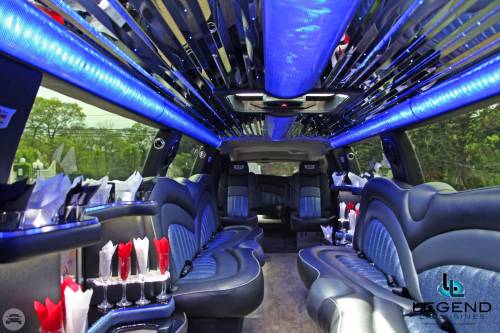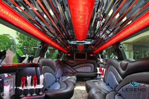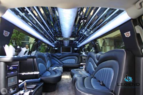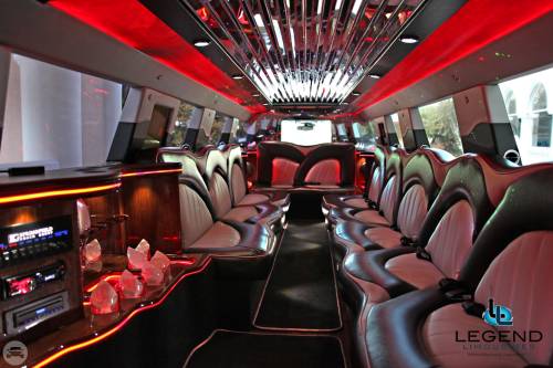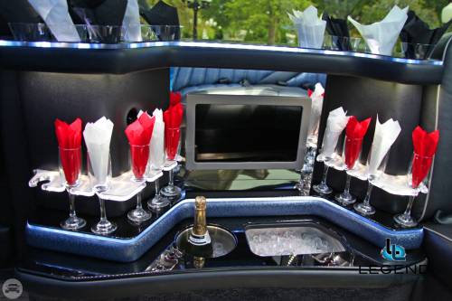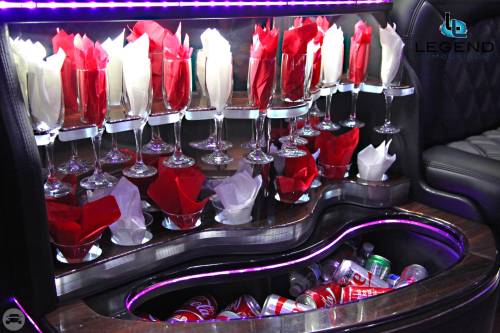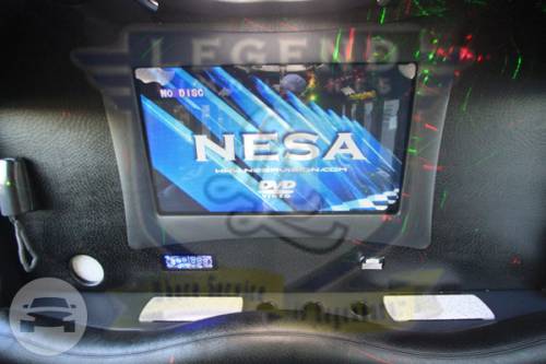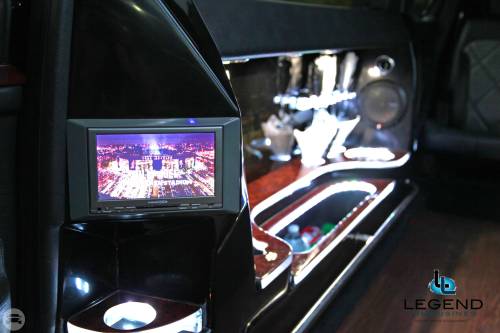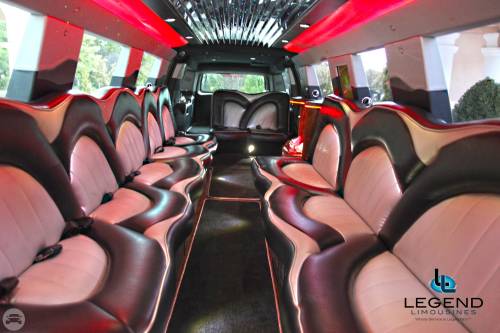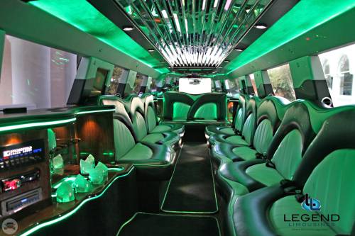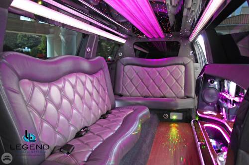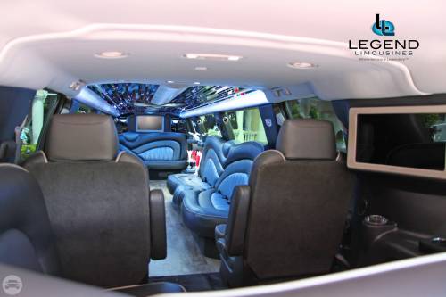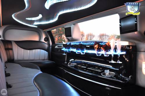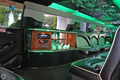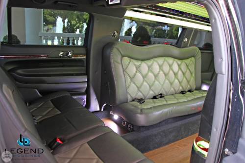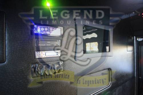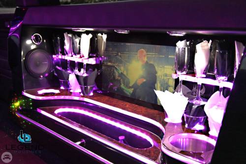 A classy choice for groups of 13-18 people. Legend’s custom designed Escalade is a true showpiece and a marvel of modern technology. Built by one of the top builder’s in the industry, the Escalade boasts the original Cadillac “white diamond” pearl white paint, 20” Lexani chrome wheels, a sleek solid window construction, and a fifth door up from on the passenger side. The added convenience of the fifth door is essential for bridal parties and groups of older clients because it allows for the vehicle to load its passengers form the front and the rear. The interior guarantees a “WOW” factor on whoever rides inside of it. First, it features a unique seating setup that allows all passengers to remain comfortable. At no time does any passenger sit across from anyone, in other words; there are no parallel benches. The seats are of Ostridge design material. The trunk is set up with a private, “VIP” or conversation pit that seats 3-4 adults with their own climate control and 20” flat screen TV. There are 2 22” LCD flat screen TV’s inside each of the 2 bar areas; along with a 35” flat screen TV mounted into the divider that separates passengers from the driver, making a total of FOUR flat screen televisions. Fiber optic and twilight lighting are featured in and around the bars, seats, partition, and full-length stainless steel ceiling. There are 2 Cadillac emblems arranged on the partition that are made of etched flass. The strobe, laser and disco lights coordinate themselves with the stereo system that literally POUNDS!! The 3,500 watt stereo system features 11-6”x9” Alpine speakers and 6-12” Rockford Fosgate P-3 sub-woofers, which will shake and rattle every bone in the body, should you turn the volume up. The stunning color and solid window look, along with the rims, TV’s and stereo system, ensure that no matter where this vehicle goes, it makes a grand entrance.