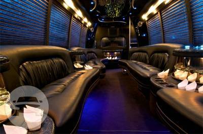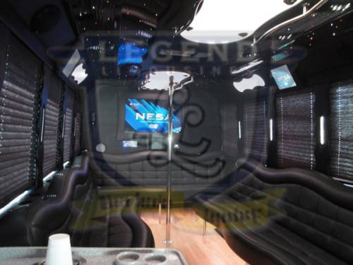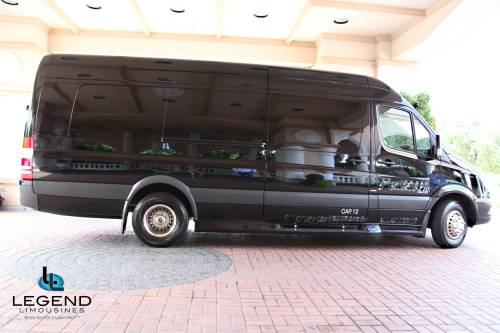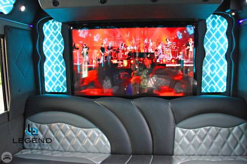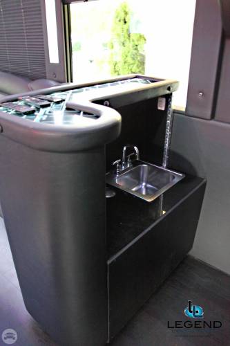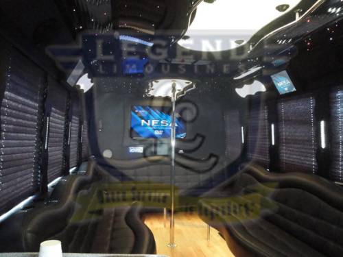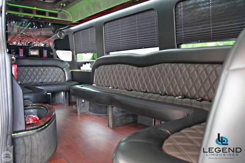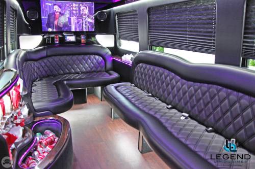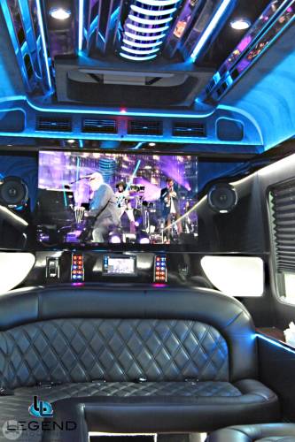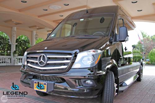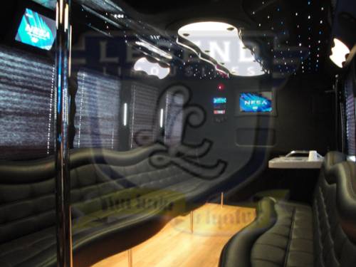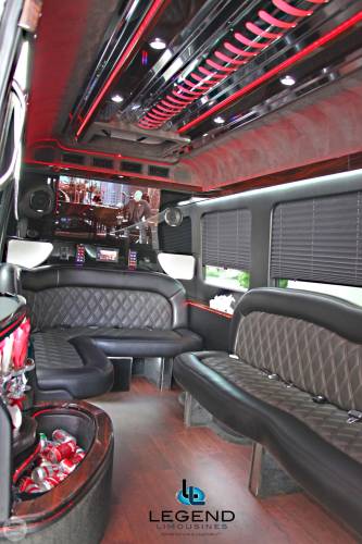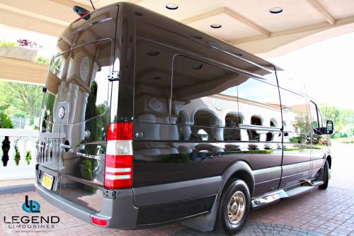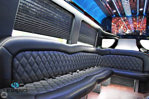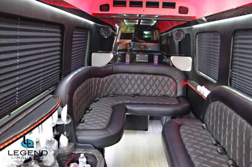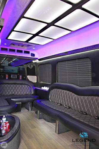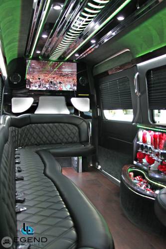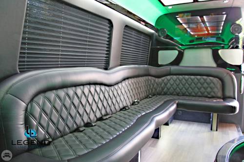 Comfortably accomodating 11-12 adults, Legend's Black Mercedes Benz Sprinter Limo Bus has a 12 passenger capacity max rating. A sliding door and molded step make entry and exit of the vehicle very easy, especially for those with mobility issues. The interior is elequently designed with a rich hard wood floor, beautifully stained dark wood bar, and dark wood accents thruought. The cieling has just the right amount of suede and stainless steel, giving the interior an ultra-modern feel. Color changing lights accent the "Maybach" cieling, and can be arranged to either cycle thru a range of colors, or remain constant on a specific color of your liking. Black seats with silver diamond pattern inserts give the interior a very clean and sharp look. There is a 35" Flat Screen Television on the back wall, and a 35" Flat Screen Television on the front wall.