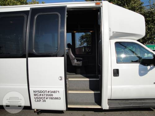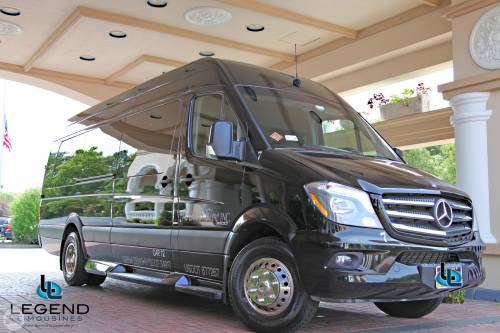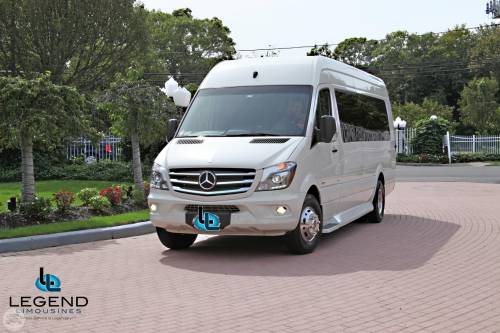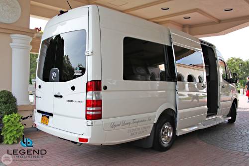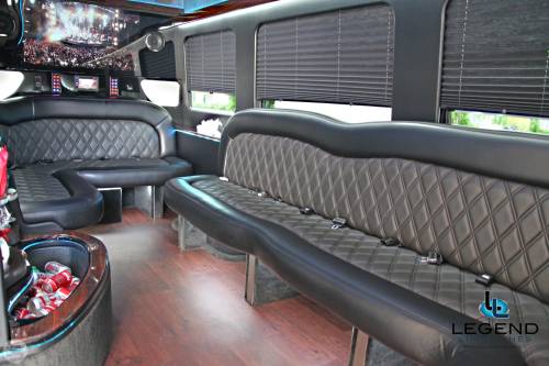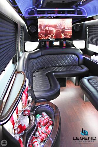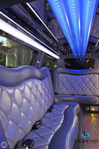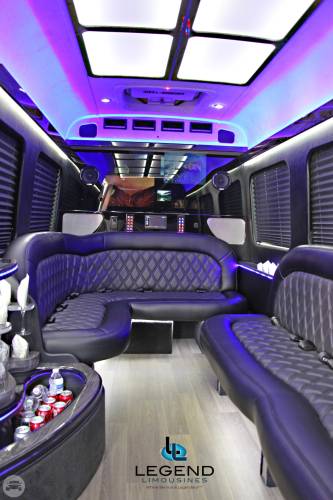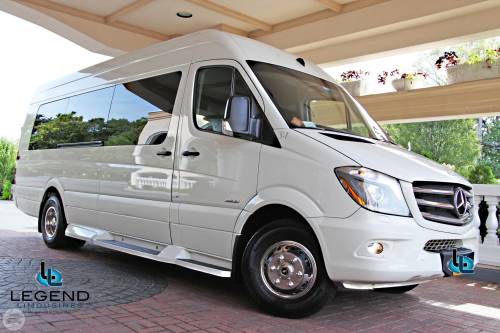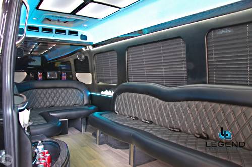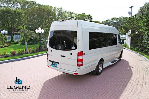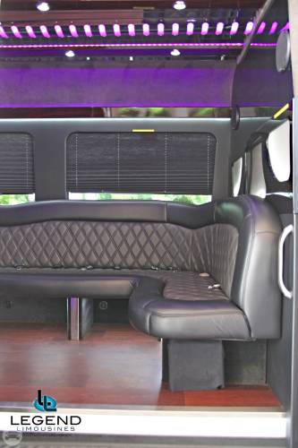 White Diamond Mercedes Benz Sprinter Limo Bus Comfortably accomodating 11-12 adults, Legend's White Diamond Sprinter Limo Bus has a 13 passenger capacity max rating. This custom designed Sprinter Limo features a unique off-white color on the exterior, with HID headlights and LED foglights. A sliding door and molded step make entry and exit of the vehicle very easy, especially for those with mobility issues. The interior is elequently designed with a rich hard wood floor, beautifully stained dark wood bar, and dark wood accents thruought. The cieling has just the right amount of suede and stainless steel, giving the interior an ultra-modern feel. Color changing lights accent the cieling, and can be arranged to either cycle thru a range of colors, or remain constant on a specific color of your liking. Black seats with silver diamond pattern inserts give the interior a very clean and sharp look. Hardwood floors Two 35" Flat Screen Televisions Blue Tooth Audio Suede and Stainless Steel Cieling 1,500 Watt Audio System with 12" Subwoofer