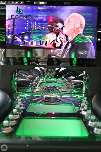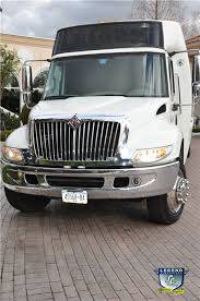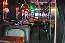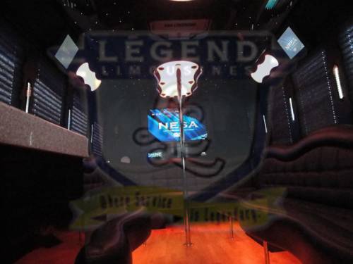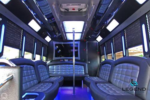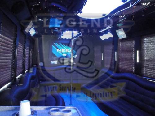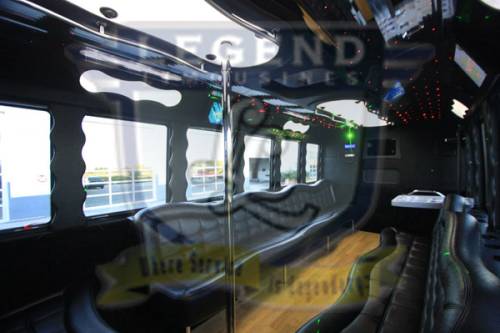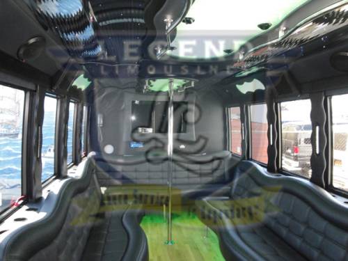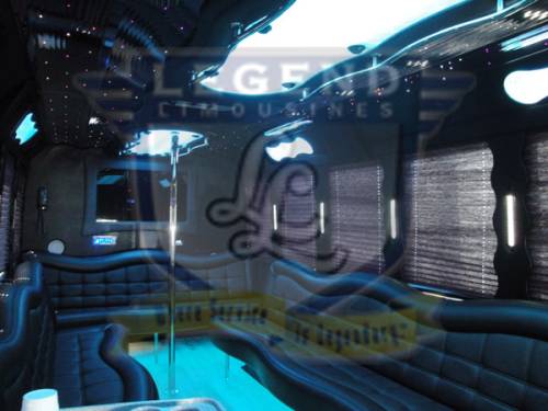 One of the hottest looking buses to ever be built, Legend’s all Black Party Bus offers the ultimate in curb appeal. The exterior features a seemless fiberglass body with sleek, frameless windows. The aluminum wheels and custom bumper with ground effects add to the “wow” factor. The interior is perfect for any occasion. Comfortably seating 18 people, this bus offers a full 8 feet of headroom. Interior options include hardwood floors, custom leather seating (Black with Blue/Silver insert), and a gorgeous black bar with cup holders. This bus features a small but immaculate bathroom with wash sink. For entertainment there is a total of 2 flat screen televisions (35” TV on the back wall, and a 27” TV on the front wall). The stainless steel cieling is decorated with Twi-Light fiber otice lighting, creating a very elegant effect. Color changing lights are located under the seats, in the rails above the windows, and in the middle of the cieling. These colors can either be set to stay on one color, or move thru several colors thru 5 different color changing modes. The 1,500 watt stereo system includes 2 seperate 12” sub-woofers. A stainless steel pole is mounted toward the rear of the bus, and is easily removable for a more subtle occasion. The rear luggage compartment also make this a perfect option for airport & cruise ship transportation.