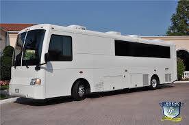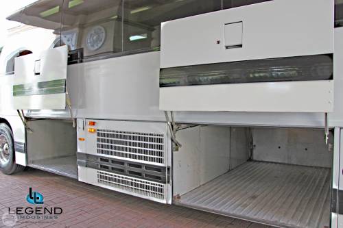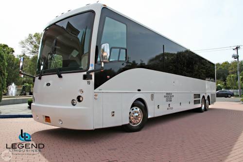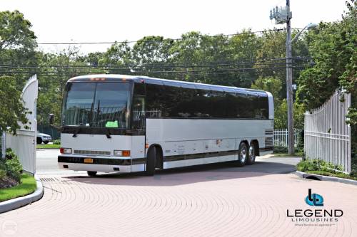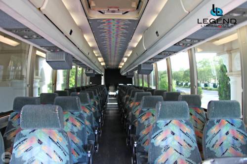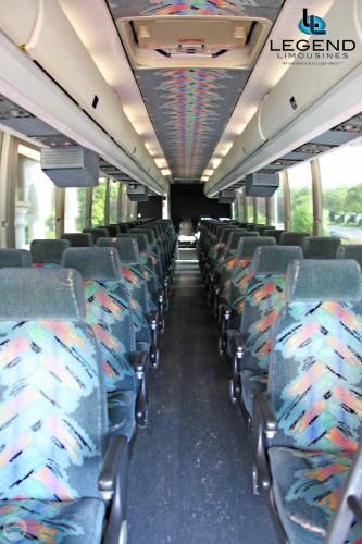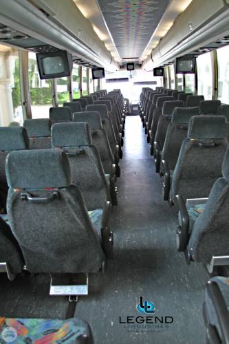 Perfect for transporting large groups, these buses feature a very comfortable seating area with great leg room, ensuring the passenger experience is a relaxed and safe one. Our Fleet of Prevost MotorCoaches are clean, sleek, and are not marked with many logos, designs, or phone numbers. Legend's Coaches feature a clean & Modern bathroom, high back reclining seats with reading lights, TV, AM/FM, Cassette/CD, PA System, overhead luggage compartment, Heat and AC. Under-belly luggage compartments have the capacity to hold luggage for 55 passengers.