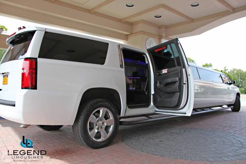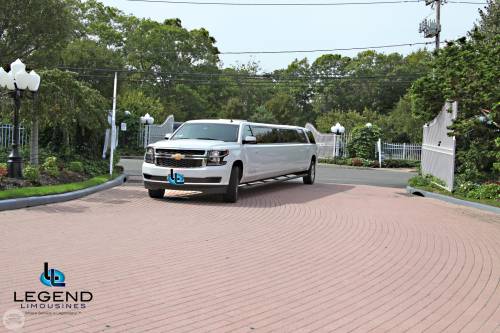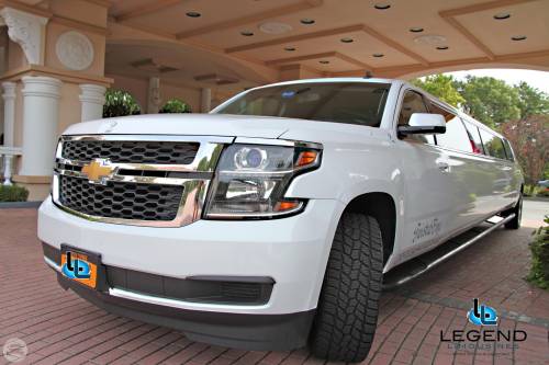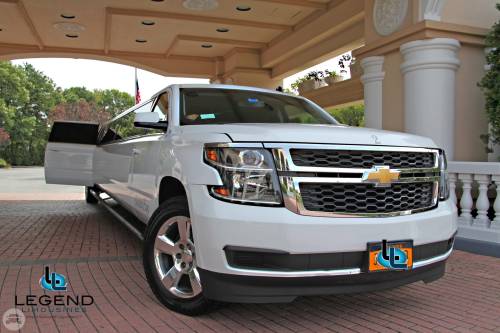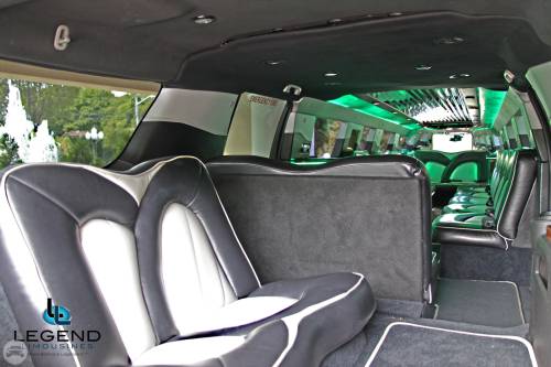 Comfortably seating 17-18 Passengers, Legend's New Body style Suburban Limo blends traditional styling with new edge technology. The white exterior with the solid window construction is very sleak. Polished alluminum 20" wheels really make the truck shine. Inside, the swooshing seat pattern is black and silver, which is also detailed on all of the pillars in the limo. Rich wood bar areas are located in the rear on the driver side, and in front on the passenger side. Color changing lights can be found in both bars, and on either side of the Stainless Steel cieling. The trunk features a private VIP area that comfortably seats 2 passengers looking out the passenger side.