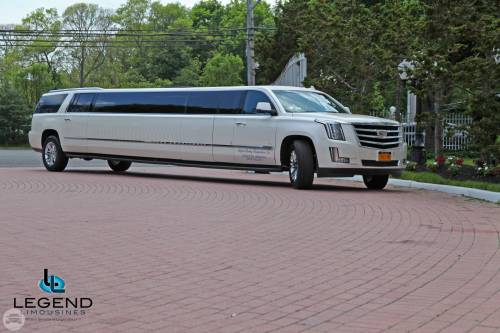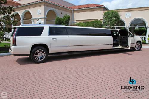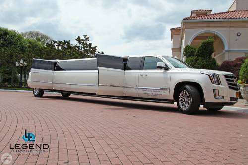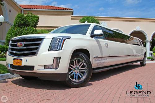 A classy choice for groups of 14-18 people. Legend’s 20 Passenger Escalade limousine is a true showpiece and a marvel of modern technology. The exterior of the vehicle is painted the original "White Diamond" Cadillac pearl white paint. The sleek, solid window look makes the vehicle look real sharp going down the road. The interior features fiber optic, strobe, and laser lighting. A high output stereo and CD player, along with four flat screen TV's complete the entertainment package. The interior also features a beautiful wood floor. The high ceiling makes the inside more spacious and easier to move around. There is even a private VIP seating area in the trunk with it's own television!