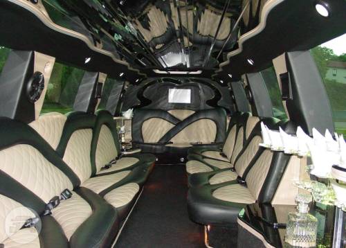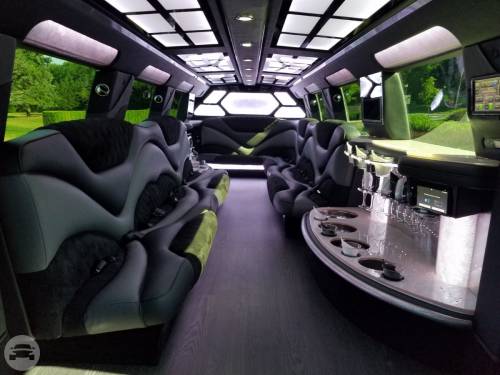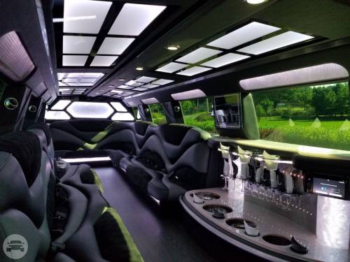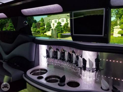 A classy choice for groups of 13-18 people. Legend’s custom designed Escalade is a true showpiece and a marvel of modern technology. Built by one of the top builder’s in the industry, the Escalade boasts the original Cadillac “white diamond” pearl white paint, 20” Lexani chrome wheels, a sleek solid window construction, and a fifth door up from on the passenger side. The added convenience of the fifth door is essential for bridal parties and groups of older clients because it allows for the vehicle to load its passengers form the front and the rear. The interior guarantees a “WOW” factor on whoever rides inside of it. First, it features a unique seating setup that allows all passengers to remain comfortable. At no time does any passenger sit across from anyone, in other words; there are no parallel benches. The seats are of Ostridge design material. The trunk is set up with a private, “VIP” or conversation pit that seats 3-4 adults with their own climate control and 20” flat screen TV. There are 2 22” LCD flat screen TV’s inside each of the 2 bar areas; along with a 35” flat screen TV mounted into the divider that separates passengers from the driver, making a total of FOUR flat screen televisions. Fiber optic and twilight lighting are featured in and around the bars, seats, partition, and full-length stainless steel ceiling. There are 2 Cadillac emblems arranged on the partition that are made of etched flass. The strobe, laser and disco lights coordinate themselves with the stereo system that literally POUNDS!! The 3,500 watt stereo system features 11-6”x9” Alpine speakers and 6-12” Rockford Fosgate P-3 sub-woofers, which will shake and rattle every bone in the body, should you turn the volume up. The stunning color and solid window look, along with the rims, TV’s and stereo system, ensure that no matter where this vehicle goes, it makes a grand entrance.