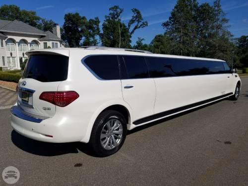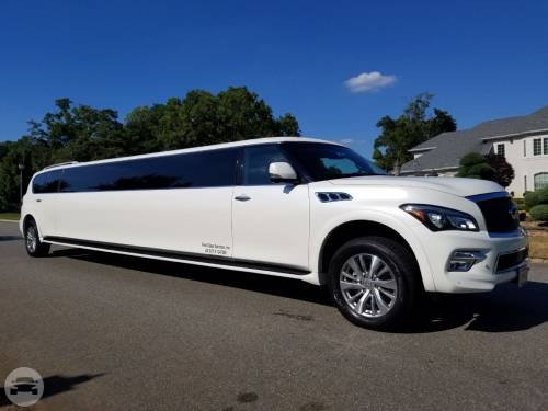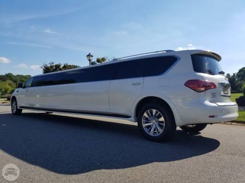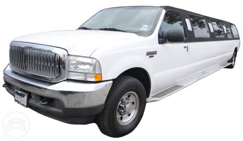 Comfortably seating 17-18 Passengers, Legend's New Body style Suburban Limo blends traditional styling with new edge technology. The white exterior with the solid window construction is very sleak. Polished alluminum 20" wheels really make the truck shine. Inside, the swooshing seat pattern is black and silver, which is also detailed on all of the pillars in the limo. Rich wood bar areas are located in the rear on the driver side, and in front on the passenger side. Color changing lights can be found in both bars, and on either side of the Stainless Steel cieling. The trunk features a private VIP area that comfortably seats 2 passengers looking out the passenger side.