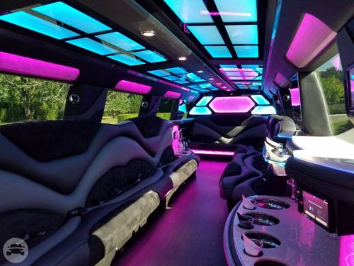 Legend's 18-20 Passenger Cadillac Escalade is a beautiful selection for groups of 13-16. The exterior of the vehicle is painted the original "White Diamond" Cadillac paint. The sleek, solid window look makes the vehicle look real sharp going down the road. The interior features fiber optic, strobe, and laser lighting. A high output stereo and CD player, along with four flat screen TV's complete the entertainment package. The interior also features a disco-like floor, which changes color with the fiber optic lighting in the bars and ceiling.