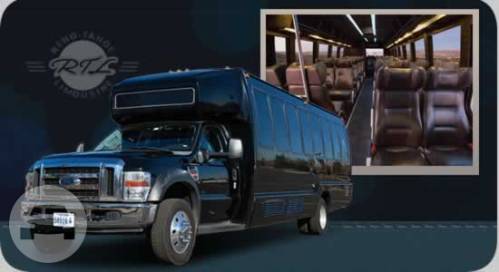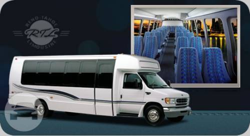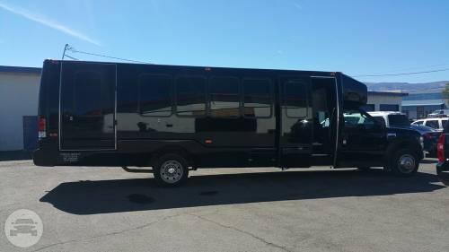 The finest mini bus in the area, with seating for 27 including luxurious high back leather seats, individual tray tables and cup holders, window shades, collapsible foot rests, seat belts, service area for cocktails and beverages, premium sound system, and air ride suspension.