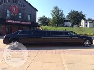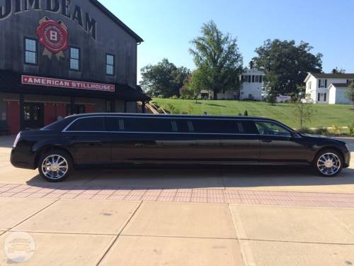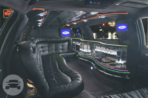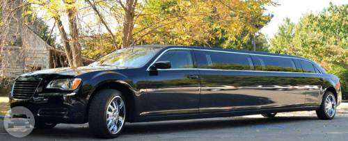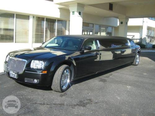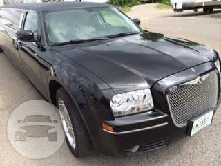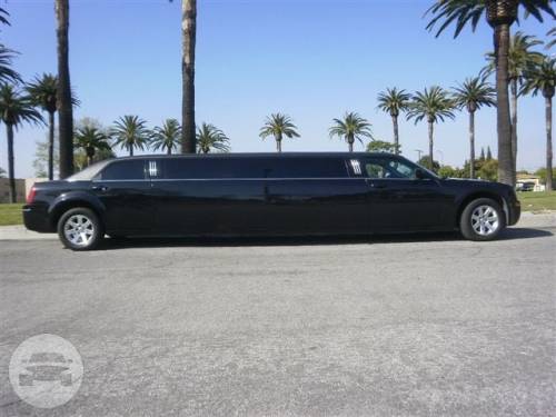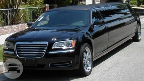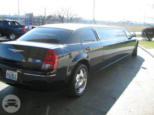 Elegant ten passenger black Chrysler 300 limousine, equipped with stereo, leather seating, beverage glasses and ice.