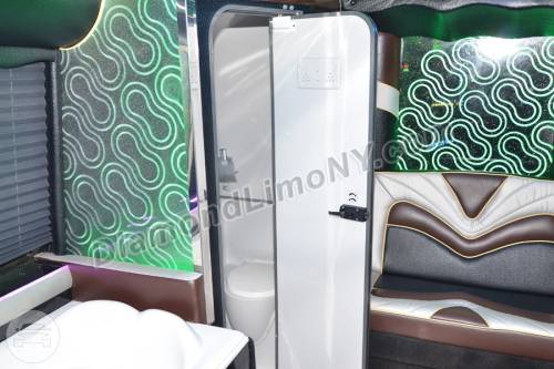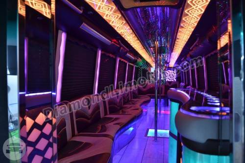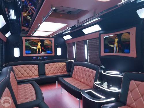 This exquisite fleet is considered ideal for wine tours, night outs, sporting events, tailgating, wedding transportation, etc. SPECIFIC FEATURES: ♦ Accommodates fifty passengers ♦ Wrap around seating style ♦ High quality surround sound system ♦ Stand up wet bars ♦ Dance poles ♦ Laser and neon lighting setting ♦ On board restroom ♦ Separate washrooms ♦ CD/DVD players ♦ Well crafted interior and celing ♦ LCD television ♦ Storage compartments