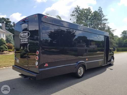 One of the hottest looking buses to ever be built, Legend’s all Black Party Bus offers the ultimate in curb appeal. The exterior features a seemless fiberglass body with sleek, frameless windows. The aluminum wheels and custom bumper with ground effects add to the “wow” factor. The interior is perfect for any occasion. Comfortably seating 18 people, this bus offers a full 8 feet of headroom. Interior options include hardwood floors, custom leather seating (Black with Blue/Silver insert), and a gorgeous black bar with cup holders. This bus features a small but immaculate bathroom with wash sink. For entertainment there is a total of 2 flat screen televisions (35” TV on the back wall, and a 27” TV on the front wall). The stainless steel cieling is decorated with Twi-Light fiber otice lighting, creating a very elegant effect. Color changing lights are located under the seats, in the rails above the windows, and in the middle of the cieling. These colors can either be set to stay on one color, or move thru several colors thru 5 different color changing modes. The 1,500 watt stereo system includes 2 seperate 12” sub-woofers. A stainless steel pole is mounted toward the rear of the bus, and is easily removable for a more subtle occasion. The rear luggage compartment also make this a perfect option for airport & cruise ship transportation.