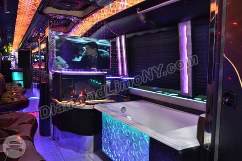 This Brand New 2013 Party Ride Bus is the ultimate in luxury and convenience. With seating up to 50 passengers including VIP area. This bus is equipped with decorative lighting, tile floor, bathroom, Jacuzzi, Fireplace, 3 Big Flat screen TVs. CD/MP3/AM/FM Stereos, iPod connection DVD, Strobe Lights, stand up bar, ice coolers, 3 lasers, 2 dance poles, disco ceiling with fiver all around. 4000 watts sound system and accessible rear controls that will make you feel like you are at a club. These elegant limousines are at your service for any occasion. **************************** ALL weddings come with FREE bottle of champagne! White runner and red carpet available for additional charge. Vehicles come stocked with water and ice. BYOB (Bring your own bottle) on all vehicles, due to New York State law we cannot provide any alcohol. NO ALCOHOL ALLOWED ON PROMS!! ****************************